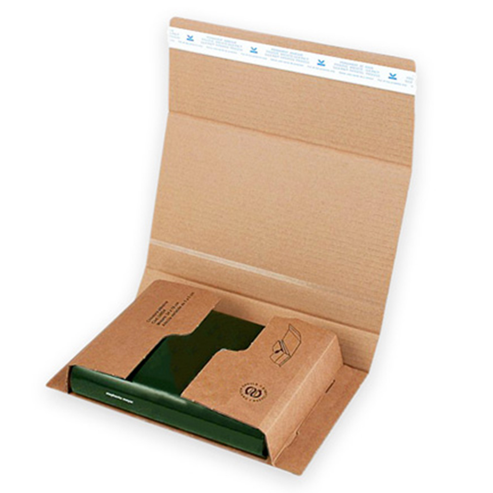 Adaptable en hauteur, l'étui carton adhésif pour livres est spécifiquement conçu pour leur expédition postale en s'adaptant à l'épaisseur de leur contenu par simple pliage autour du produit ainsi parfaitement maintenu et protégé.