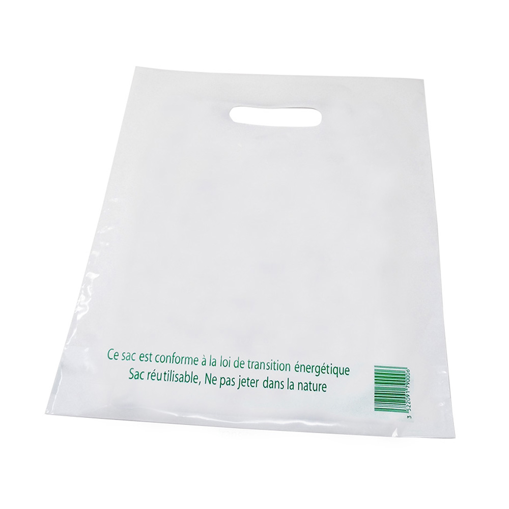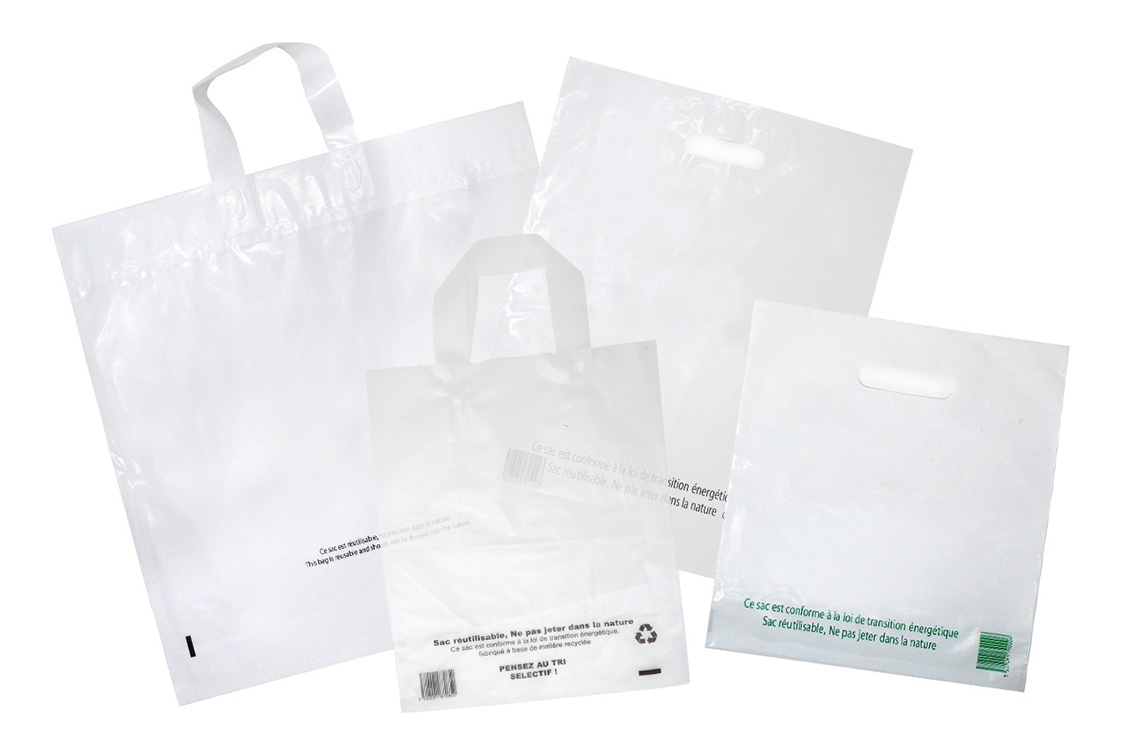 Sacs plastique à poignées réutilisables, spécialement conçus pour les commerces et boutiques recherchant un emballage solide, pratique et valorisant pour leurs clients.