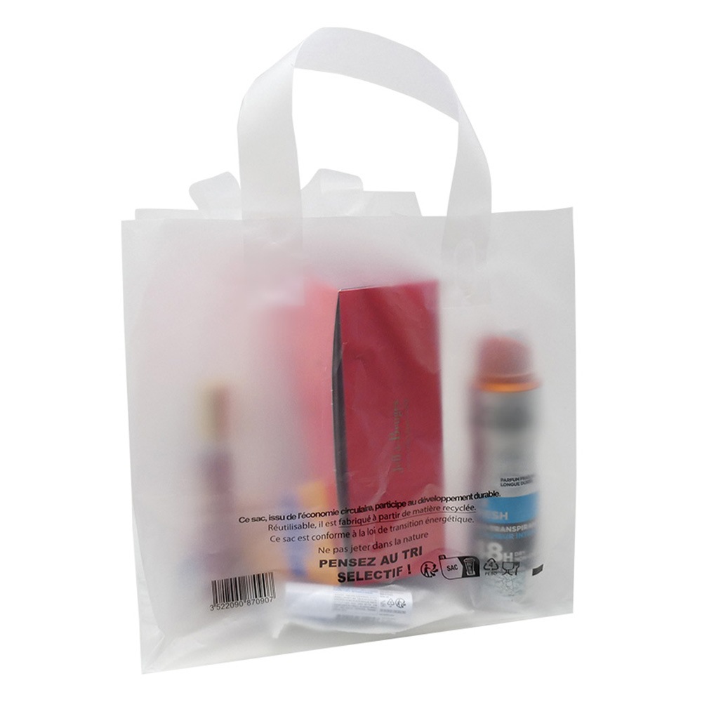 - Ce sac haut de gamme, esthétique et raffiné se distingue par son aspect givré semi-transparent, inspiré de l'effet "papier calque", très apprécié des boutiques misant sur l'élégance (Réf SACPOI4 et SACPOI5).