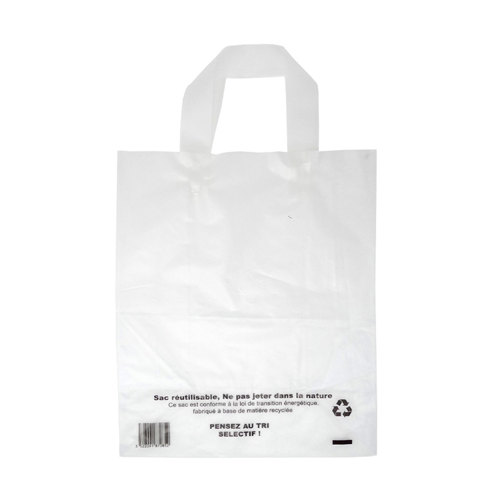 Sacs plastique translucide "givré" à poignées souples, spécialement conçus pour les commerces et boutiques recherchant un emballage haut de gamme, solide, pratique et valorisant pour leurs clients (format 26x14x32 cm en colis de 500).